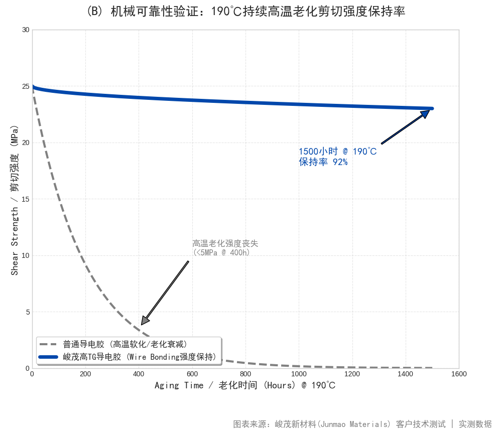 - 峻茂高 TG 导电胶:我们Tg 点设计在 120°C - 200°C 范围。即使低温固化导电胶也能保持120℃以上的TG。在键合温度下,胶层依然保持高储能模量 (High Modulus),为芯片提供坚实的刚性支撑,确保金线键合拉力测试 (Pull Strength) 达标。意法半导体测试峻茂高TG款导电银胶在190℃连续1500小时的老化测试仍然能保持92%的剪切强度。