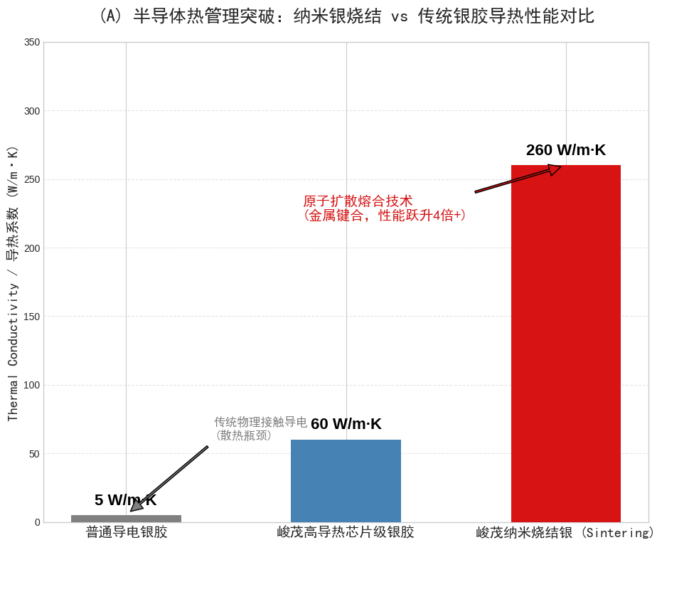 - 超高导热:峻茂烧结银的导热系数可达 160-260 W/m·K,峻茂最高的芯片级导电胶导热系数是60W,导热差距达3倍以上,有效降低结温(Tj)。
